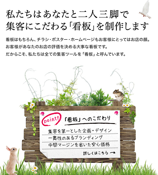お客様を引き付けるのには何が必要か。私たちはあなたのお店に最適な看板を提案致します。設置からメンテナンスまで全てサポートします。